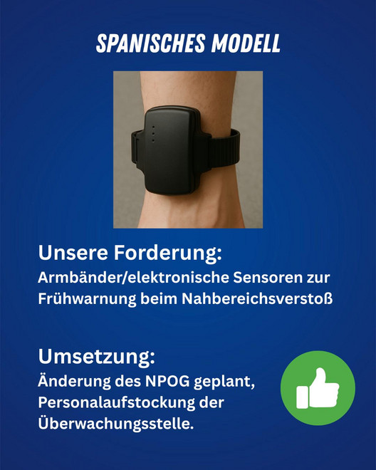 Wir befürworten die Einführung des sogenannten „Spanischen Modells“. Dieses Modell zeichnet sich dadurch aus, dass im Kontext des Gewaltschutzes Täter und TäterInnen ein Armband, ähnlich einer elektronischen Fußfessel, tragen.