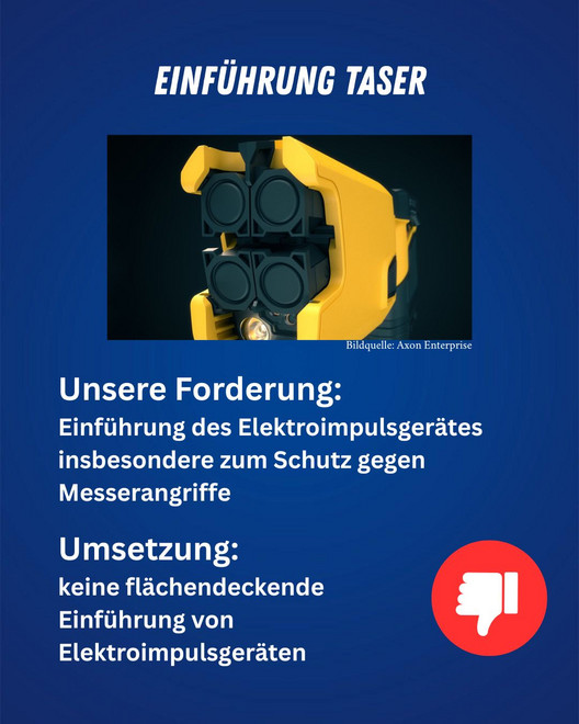 Gerade im Hinblick auf den stetigen Anstieg von Messerangriffen ist der Taser ein milderes Einsatzmittel als die Schußwaffe, um Verletzungen der Angreifer zu minimieren.