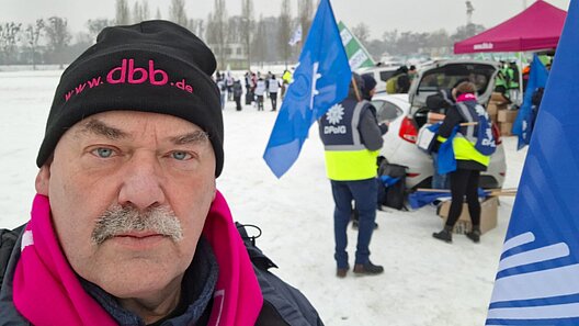 Auf Hannovers Schützenplatz stattet der dbb die Streikenden mit wärmenden Mützen und Signalpfeifen etc. aus, kurz mit allem, was warmhält und zum Krach machen geeignet ist. Mit Reisebussen treffen die Mitglieder der unterschiedlichsten Gewerkschaften ein, alle bei bester Laune und hinter so mancher kaltroten Nase funkeln erwartungsvolle, glückliche Augen.